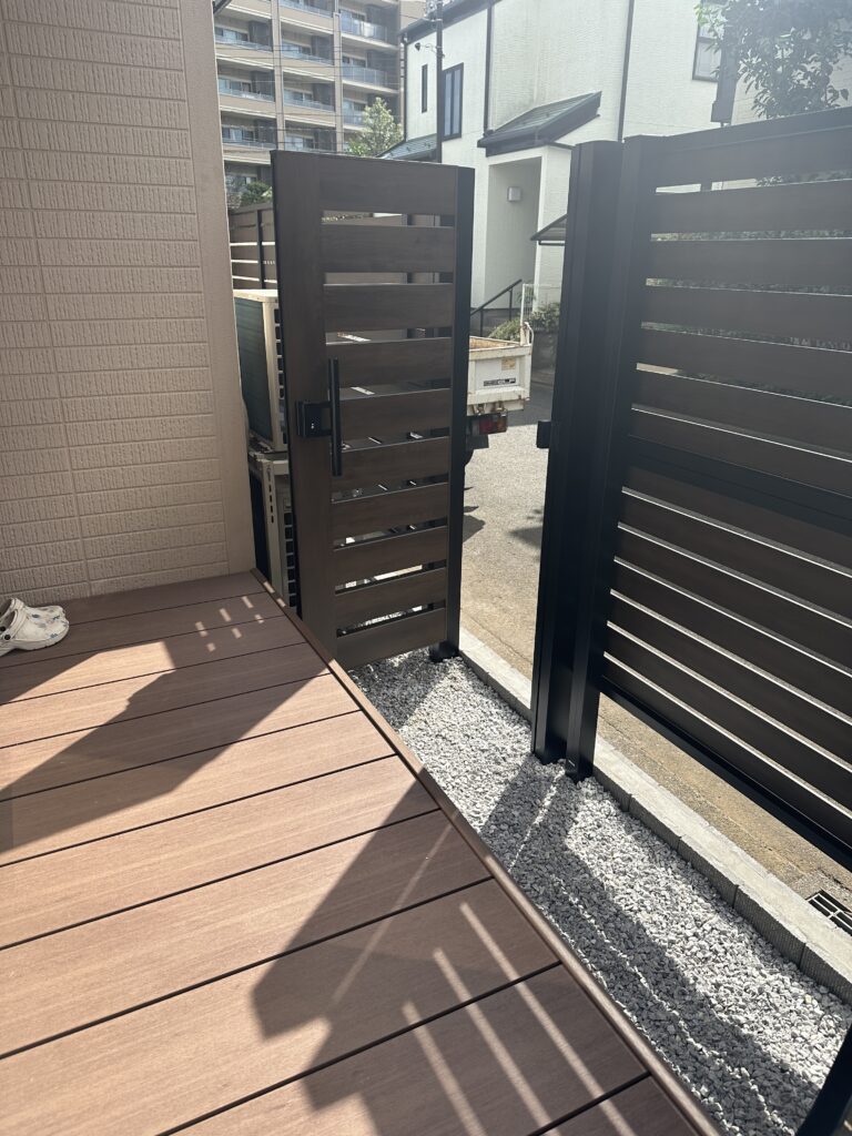 門扉を開いた状態 開いた扉がデッキにぶつからないギリギリの位置に建っています