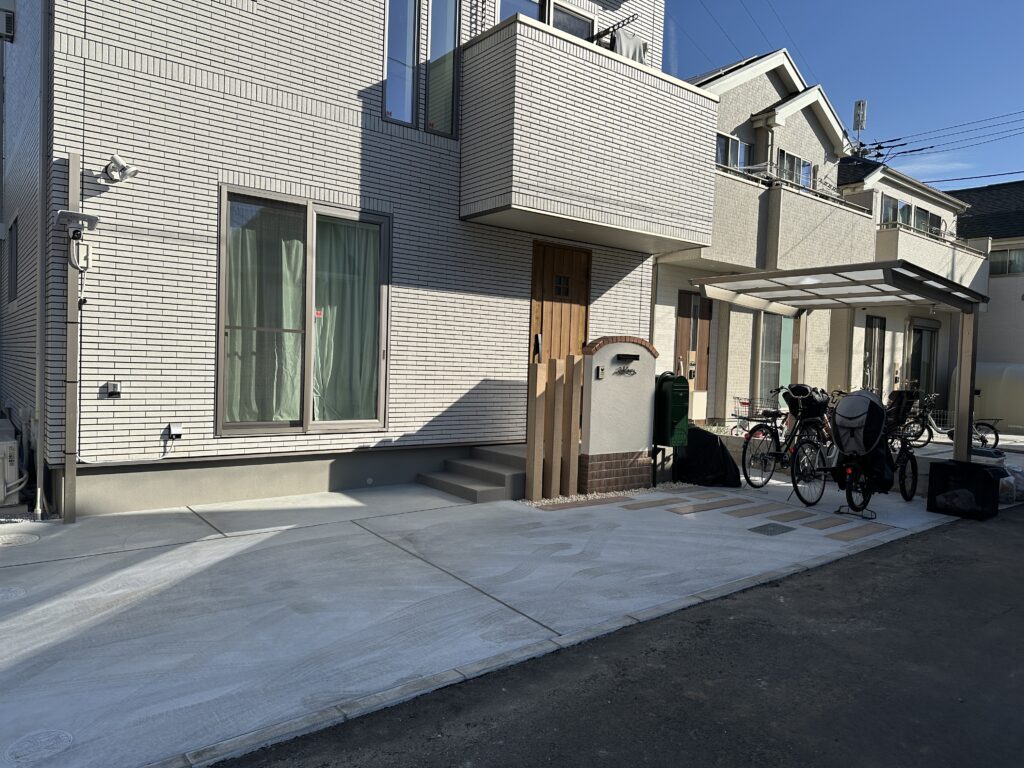 コンクリートの中に枕木を配置した印象的なアプローチの新築外構です