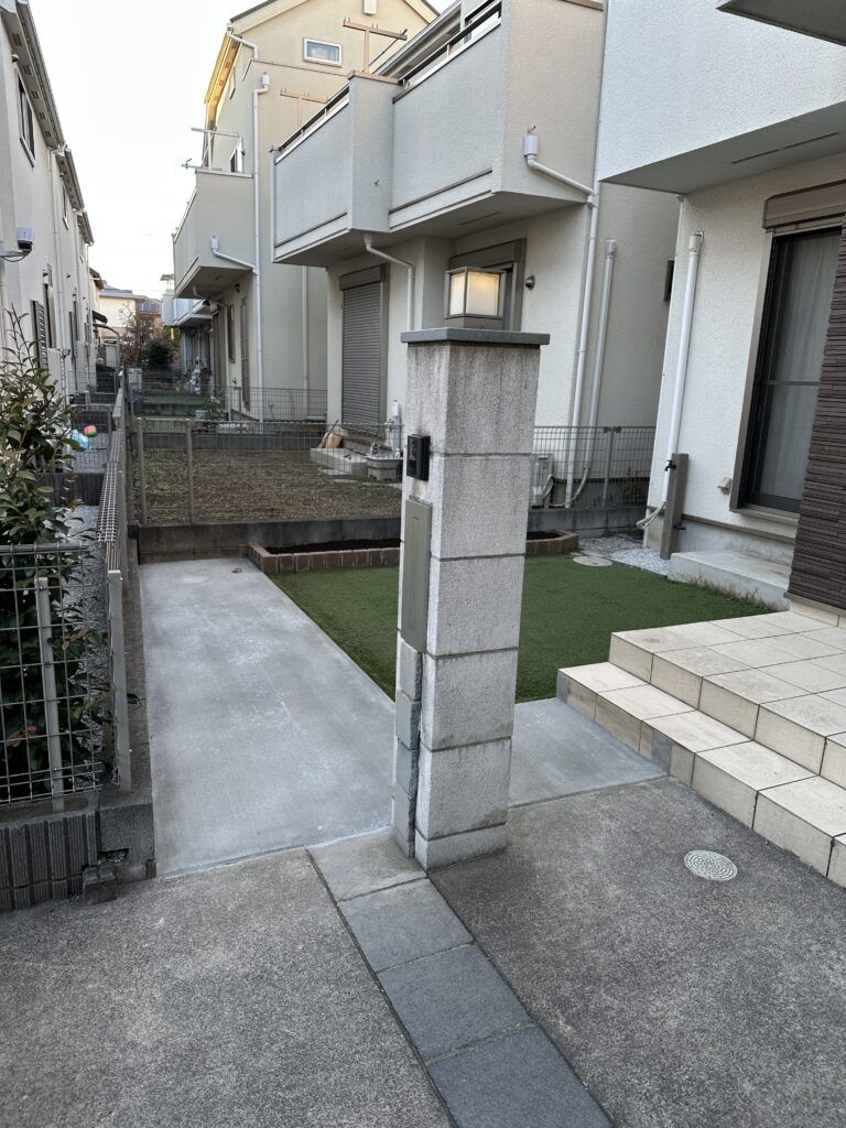 手前のコンクリート部分は駐輪場として使い、お庭部分は人工芝敷きとなりました