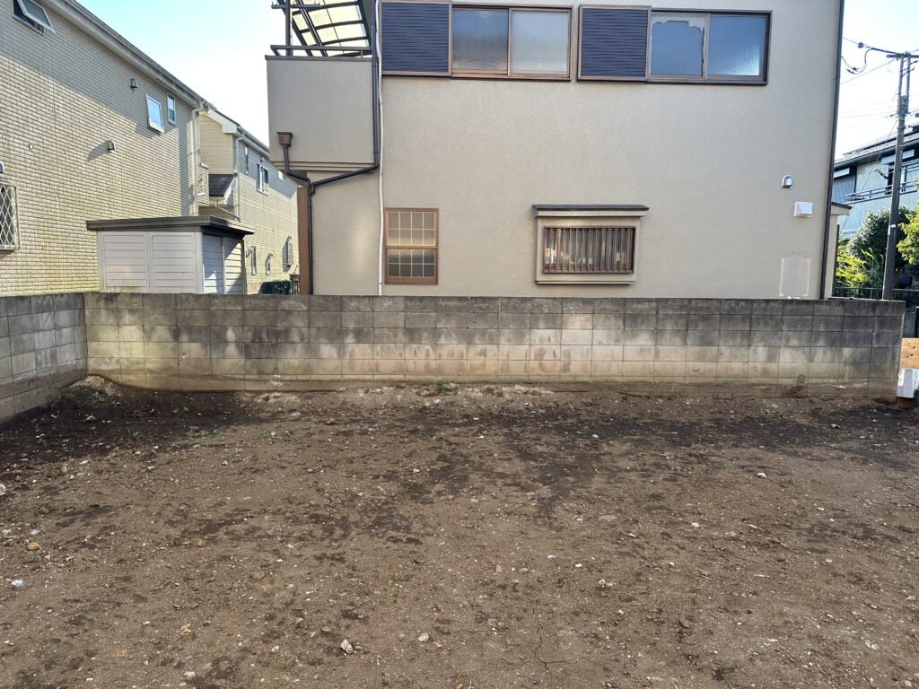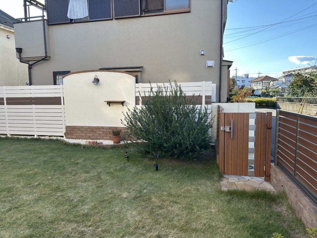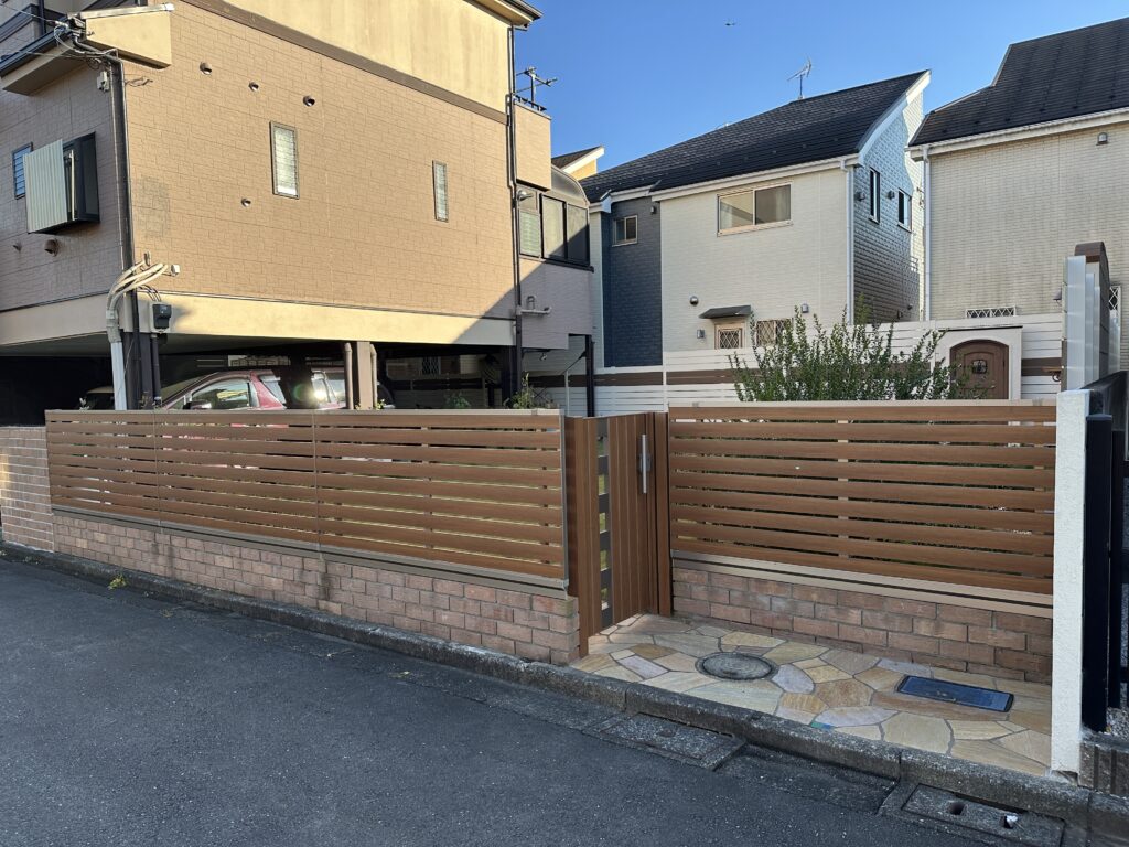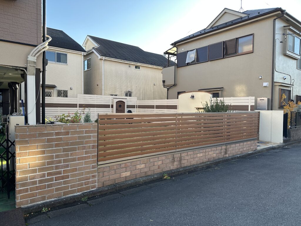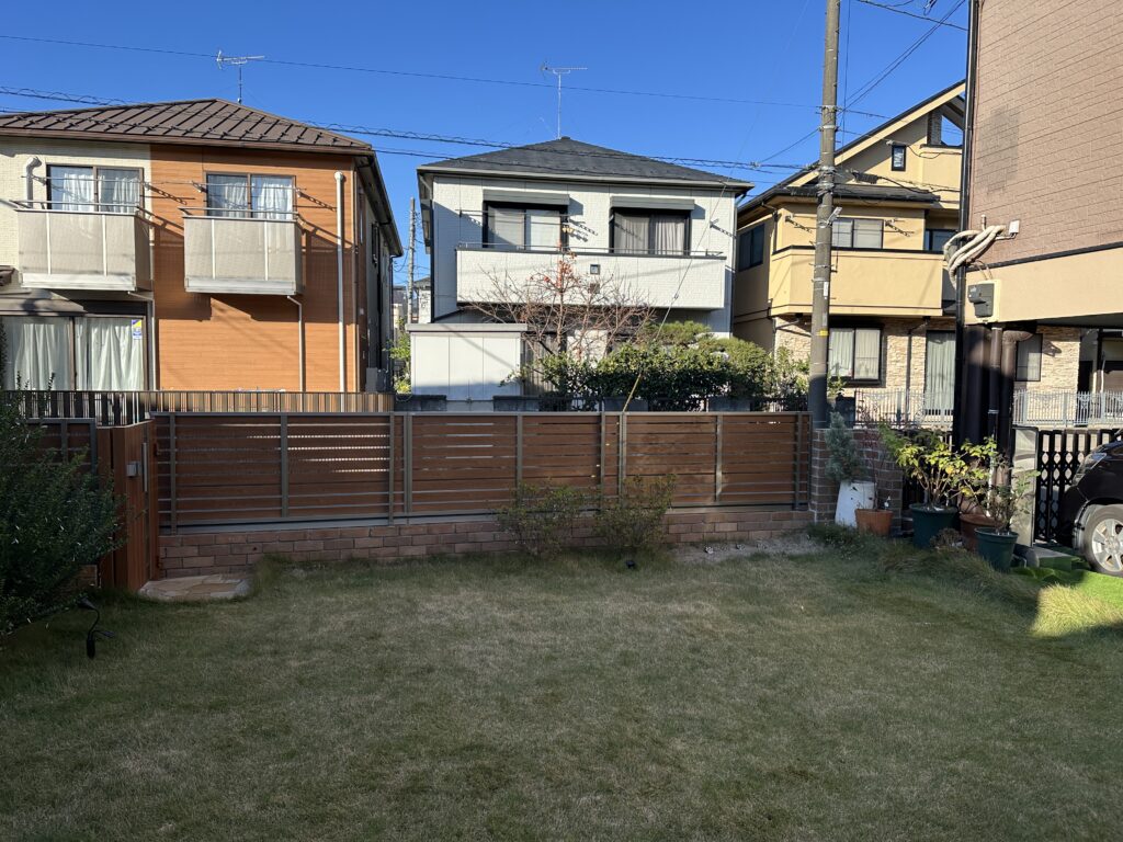 レンガ塀+木調アルミフェンス+門扉で土留め&目隠しとしました