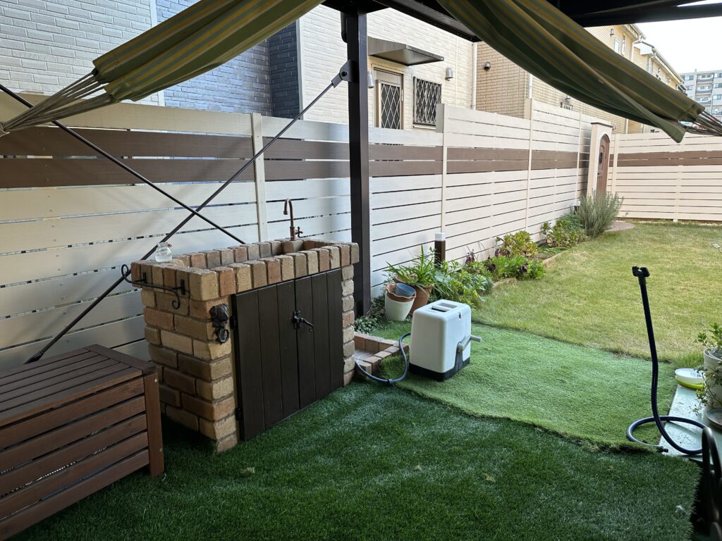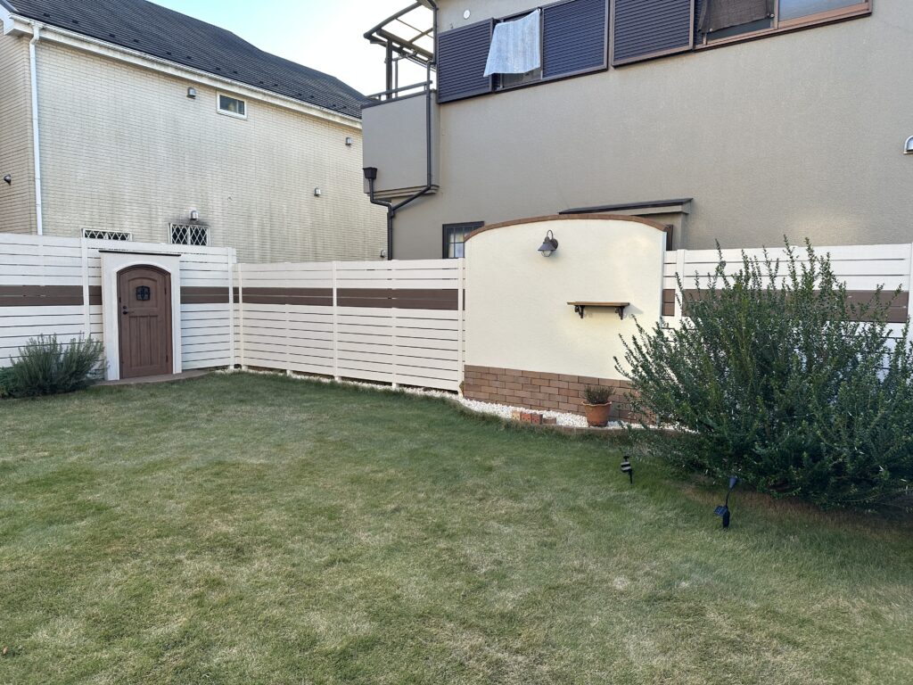 思い切ってお庭全体を樹脂製フェンスで囲って、隣家台所からの目線はデザイン塗壁で目隠ししました