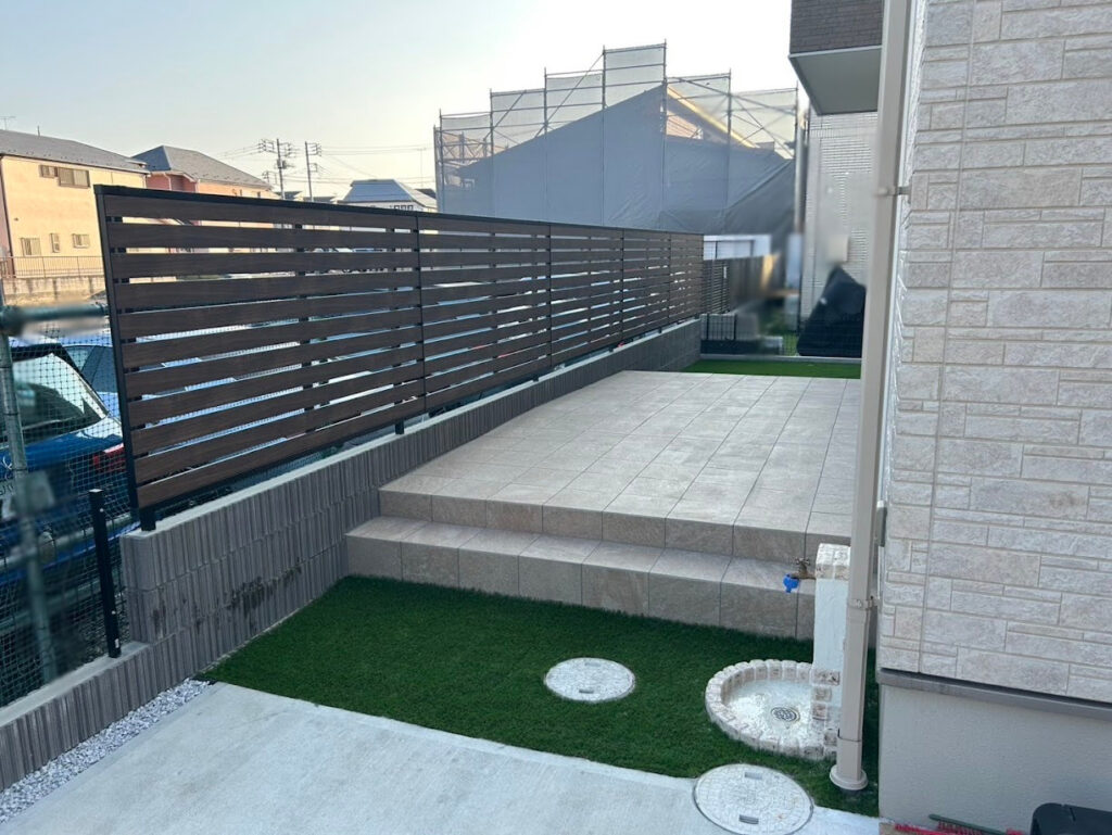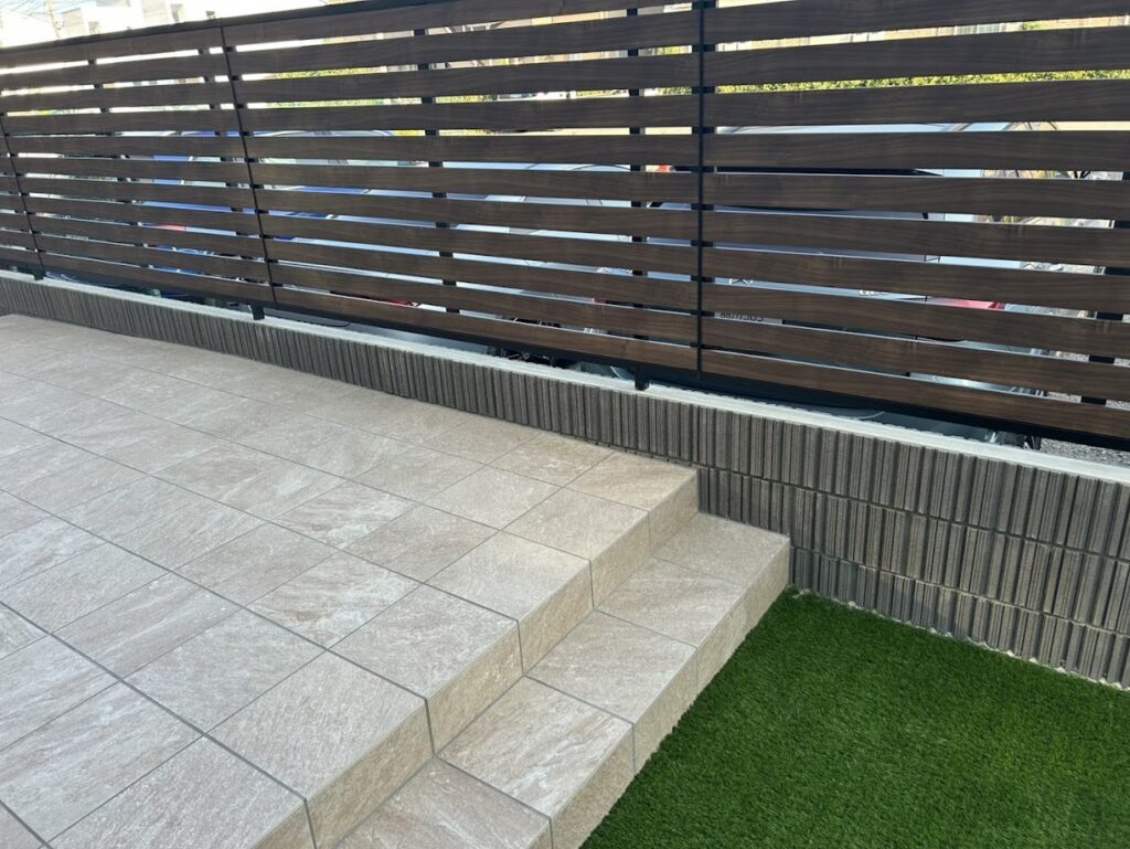 境界の化粧ブロックまでタイルテラスを造作しているので、スッキリとまとまっています