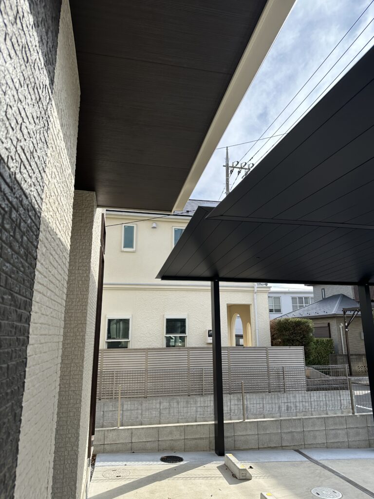 間口全体を屋根にする2台用や3台用も検討しましたが、建ぺい率の関係で2台に分ける事になりました